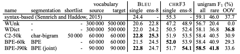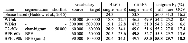 우리는 BPE를 사용했을 때, 처음 보는 단어를 접한 경우 성능이 얼마나 좋아지는지와 어느정도 크기의 vocabulary size를 유지해야지 제일 좋은 성능을 제공할 수 있는지를 알아보려고 한다. 크게 두 가지 데이터셋을 사용한다. (English-German, English-Russian) 성능 측적을 위해서 BLEU와 CHRF3(character n-gram F3 score, 사람의 평가와 유사한 결과를 제공한다고 함)를 사용한다.