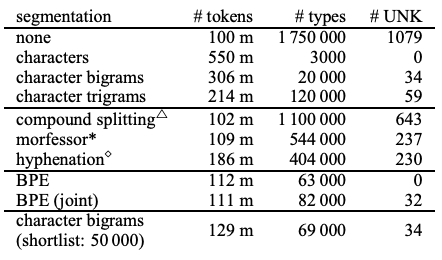 Baseline으로는 bilingual dictionary based on fast-align(WDict으로 표기) 모델을 사용한다. 해당 모델은 자주 등장하지 않는 rare word에 대해서 back-off dictionary를 사용한다. WUnk의 경우 back-off dictionary를 사용하지 않고, 처음 보는 단어를 접한 경우 모두 <UNK>로 표기하는 방벙이다. 또한, character n-gram에 대한 baseline도 지정하는데, n-gram의 경우 n의 크기가 성능에 큰 영향을 준다. unigram의 경우, 제대로된 open-vocabulary를 제공할 수 있지만, 성능이 좋지 않았기 때문에 bigram(char-bigram으로 표기)을 baseline으로 지정했다. 그외에도 다른 segmentation 들이 존재하지만(frequency-based compound splitting, rule-based hyphenation 등) open-vocabulary translation에 적합하지 않다고 판단되어 제외했다. English-German 데이터셋에 대한 segmentation 정보는 [표-1]과 같다.