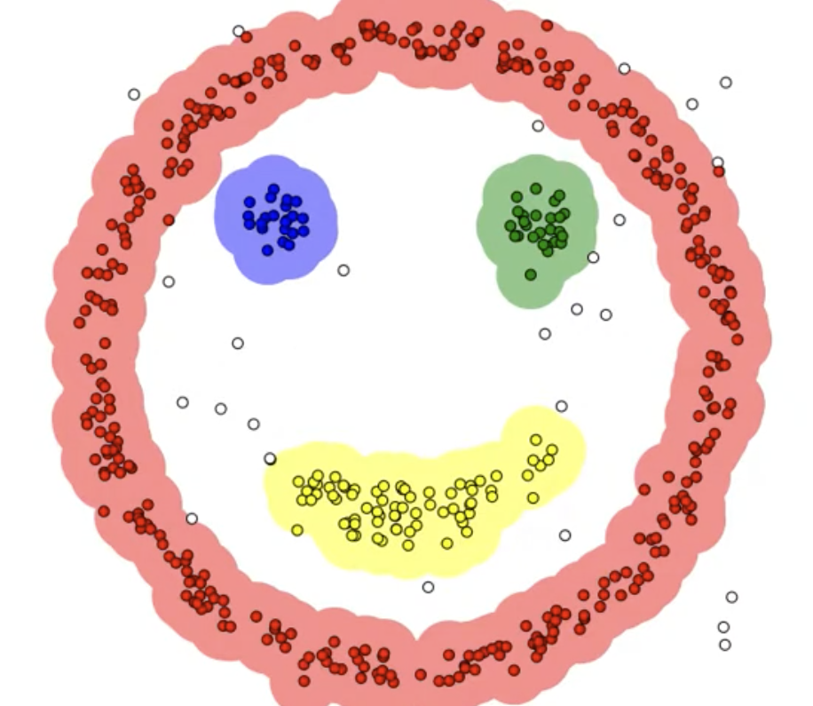 DBSCAN을 설명할 때 많이 사용되는 예시이다. 그림을 보면 각 색마다 클러스터를 형성했고, 색에 포함되지 않는 점들을 outlier로 분류된다.