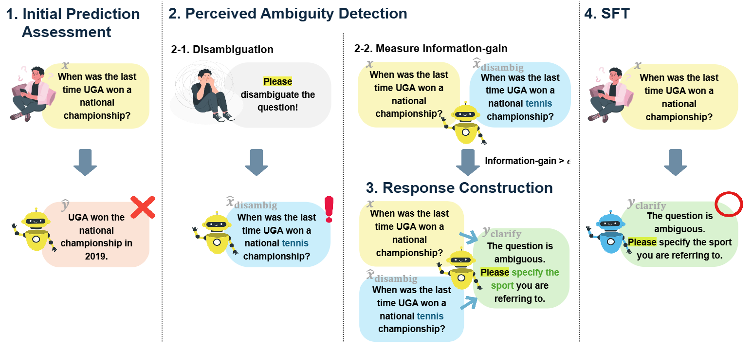 이러한 과정을 거쳐 LLM은 사용자로부터 모호한 질의가 제공되었을 때 사용자의 의도에 맞지 않은 오답을 생성하는 것이 아닌, 사용자의 의도를 확인하는 clarification request를 생성하도록 학습된다.