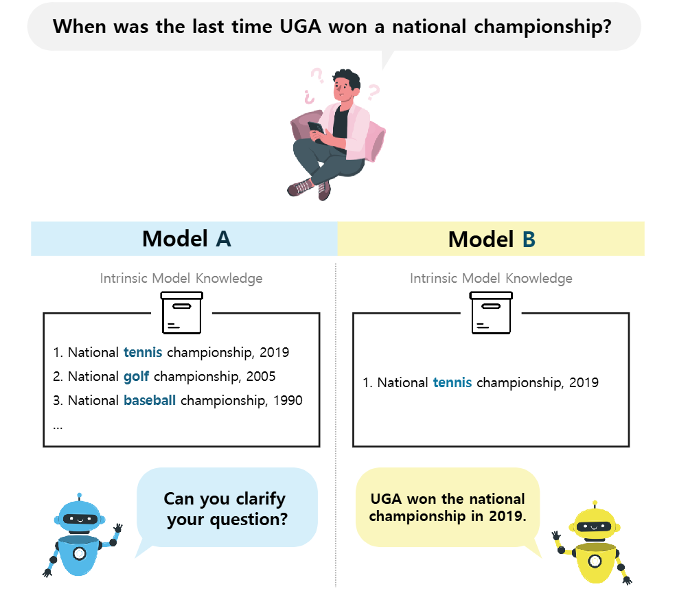 위 예시에서 Model A의 경우 national championship과 관련된 다양한 지식을 보유하고 있다. (tennis, golf, baseball, ...) 이렇게 다양한 지식을 보유하고 있는 모델에게 national championship에 대한 질의를 제공하면 모호하다고 판단하게 될 것이다.