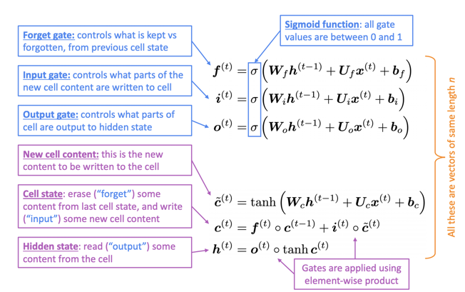 - $ c $ : 이전 cell state에서 유지되어야 할 값이 forget gate를 통해서 유지되고, 새로 생성된 cell content의 값 중 기록해야 할 값을 output gate를 통해서 기록된다.