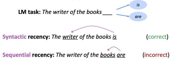 RNN의 이러한 문제는 [그림-3]과 같은 현장을 발생시킬 수 있다. LM task로 마지막 단어를 예측해야 하는 경우, 정상적인 답안은 writer 와의 dependency를 학습해서 "is"라는 결과를 제공하는 것이다. 하지만, RNN의 경우, 가까운 dependency를 더 잘 학습하기 때문에, sequential recency를 학습하게 되고, books 와의 dependency를 학습해서 "are"이라는 잘못된 결과를 제공하게 된다. RNN-LM은 이렇게 syntactic recency 보다, sequential recency를 더 빠르게 학습하게 되고, 그로 인해서 잘못된 결과를 제공할 수 있다.
