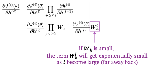 [그림-1]을 보면 back-propagation을 하는 과정을 볼 수 있다. 이러한 과정에서 chain rule을 이용해서 최종 미분 값을 구하게 되는데, 이때 문제가 발생하게 된다. 두 hidden state ($ h^t, h^{t+1} $) 사이의 미분 값을 구하게 되면 $ W_h $ 를 구할 수 있다. 모든 timestep 마다 동일한 $ W_h $ 를 사용하기 때문에, 모든 hidden state 사이의 미분 값은 동일하게 $ W_h $ 가 된다. 이때, $ W_h $ 의 크기가 너무 작아지는 경우, 작은 값끼리 곱하기 때문에 더욱 작은 값이 결과로 제공되고, 최종적인 gradient 값이 매우 작아지는 문제가 발생한다. 이러한 문제를 수식으로 표현하면 [식-3]처럼 표현할 수 있다.